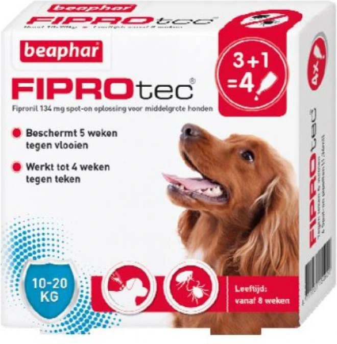 Fiprotec tegen vlooien en tekenDruppels tegen teken&vlooien in handige pipet. Het is een Fipronil spot-on oplossing voor honden. Geschikt voor honden vanaf 2 maanden en tussen 10 en 20 kilogram lichaamsgewicht. Ideaal om honden langdurig te beschermen tegen teken en vlooien. Er zijn 4 verpakkingen voor verschillende gewichtsklassen. * Langdurige werking tegen vlooien tot 6 weken * Werking tegen teken 3-4 weken (afhankelijk van soort) * 1 pipet per behandeling, 4 pipetten in verpakking * Handige pipet voor toediening in de nek * Pipet kan na het openen neergezet worden, zodat de huid van de hond goed vrijgemaakt kan worden met 2 handen voor het toedienen van de pipet.