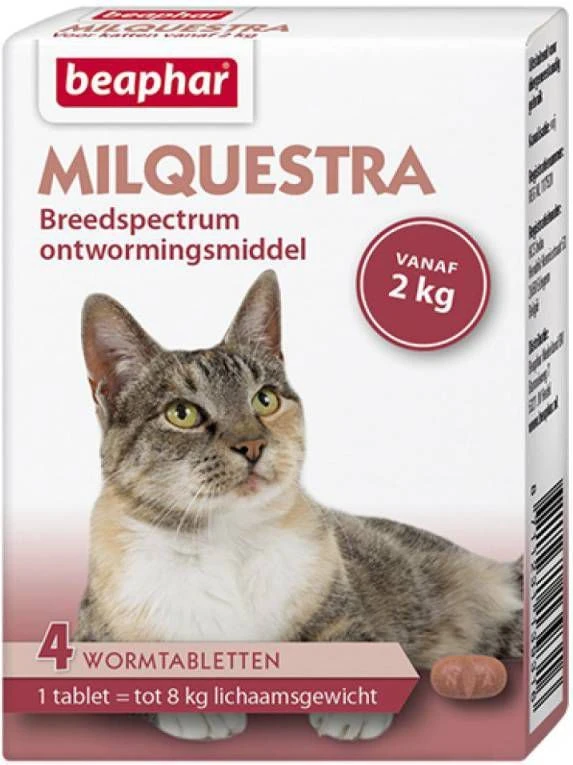 Beaphar Milquestra is een ontwormingsmiddel voor katten. De tabletten zijn geschikt voor katten ouder dan 6 weken met een minimaal gewicht van 0,5 kg. Ze werken tegen spoel-, haak- en (vossen)lintwormen en tegen hartwormziekte. Daarnaast pakt dit ontwormingsmiddel de vossenlintworm, oog- en longworm en de Frans hartworm aan. Door de rundvleessmaak worden de pillen sneller geaccepteerd door uw kat. Meer informatie over het ontwormen van uw kat vindt u hier.Voor honden is er Beaphar Milquestra Hond.