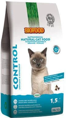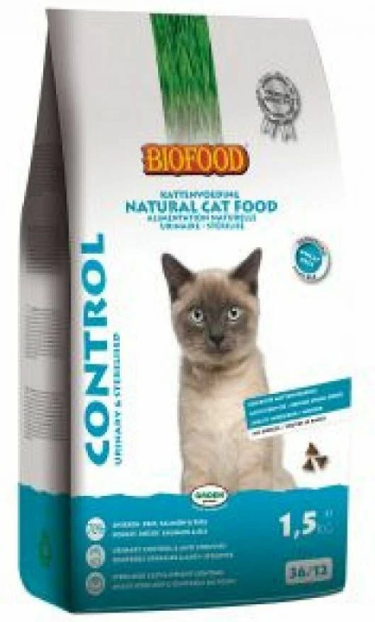 Biofood Kattenvoer Premium Control Urinewegen/Gesteriliseerd 10 kgBiofood control is hoogwaardige volledige natuurlijke kattenvoeding die ontwikkeld is voor volwassen katten, ter ondersteuning van de urinewegen en bij overgewicht (bijv. sterilisatie). * 70% aan kip, zalm, kippenlever en rijst * Met prebiotica FOS (inuline), zalmolie met omega 3 en 6 vetzuren en taurine * Hoge acceptatie en verteerbaarheid * Voor katten met struvietaandoeningen zoals blaasgruis en stenen * Ondersteunt de urinewegen. Regelt de pH van de urine (in de richting van.