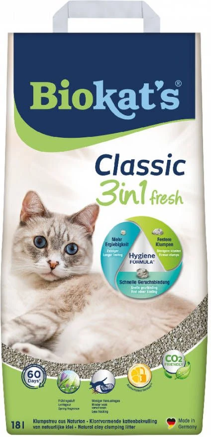 Biokat&apos, s Classic Fresh 3 In 1 Kattenbakvulling 18 direct bestellen in onze webshop! Grofkorrelige, klontvormende kattenbakvulling van natuurlijk klei