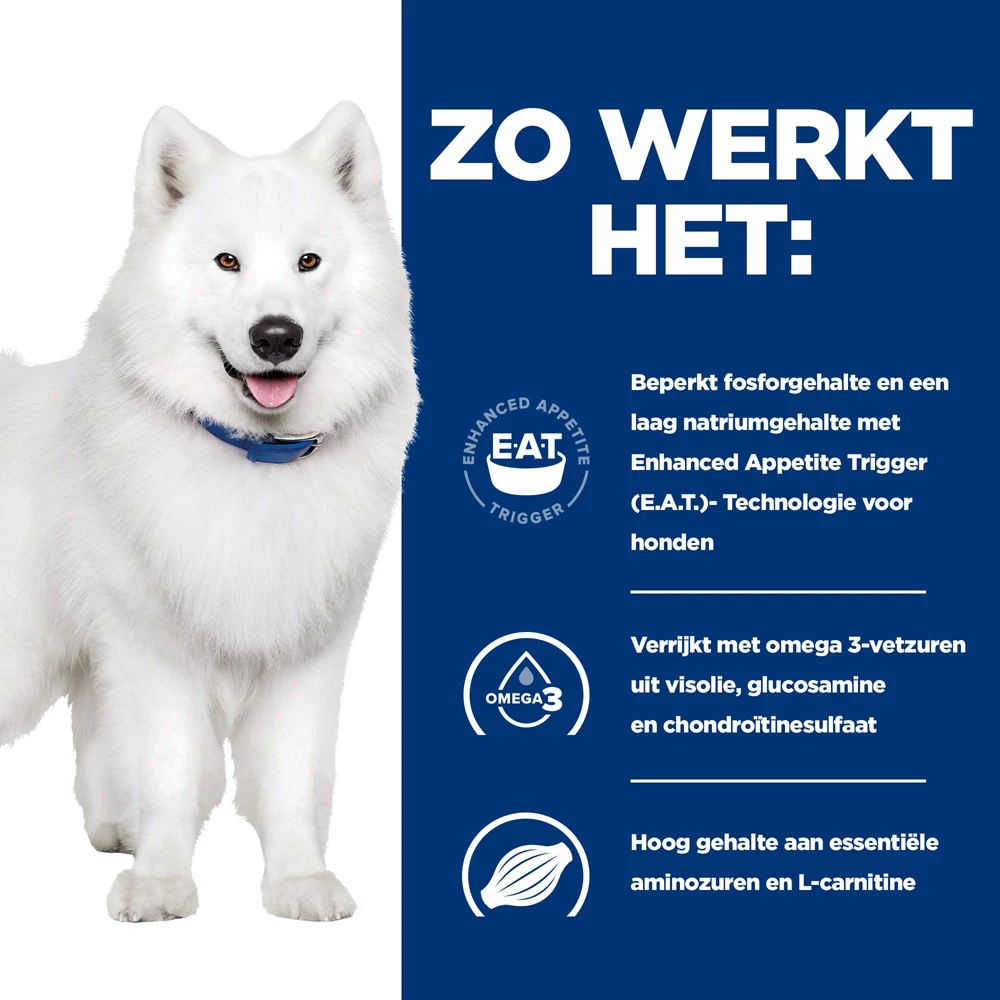 Hill’s PRESCRIPTION DIET k/d + Mobility Hondenvoer is een volledig dieetvoeder voor de ondersteuning van de nierfunctie bij chronische of tijdelijke nierinsufficiëntie en voor de ondersteuning van het metabolisme van de gewrichten in geval van osteoartritis bij volwassen honden. Dit voeder heeft een laag fosforgehalte, een beperkt eiwitgehalte, maar bevat hoogwaardige eiwitten, een hoog gehalte aan EPA en totaal omega 3-vetzuren en een adequaat gehalte aan vitamine E.,