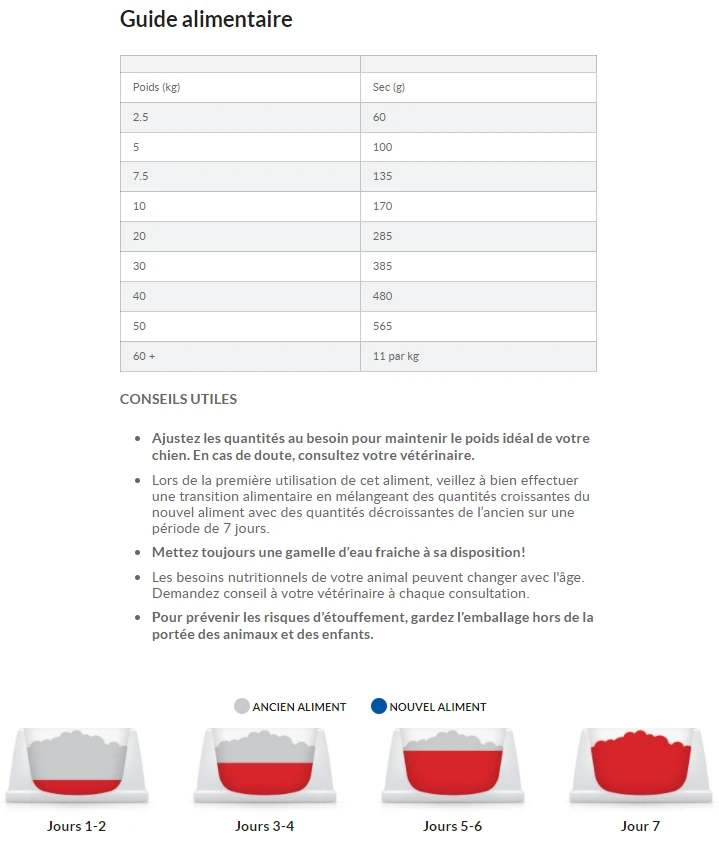 Deze hoeveelheden zijn slechts een richtlijn, omdat de behoeften van huisdieren variëren. Pas de hoeveelheid voeding aan om het optimale lichaamsgewicht te behouden.