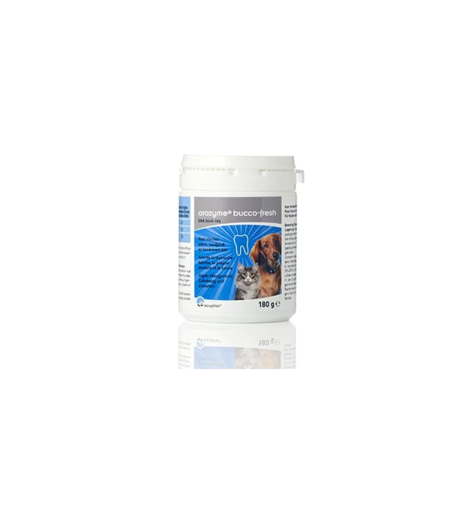 Orozyme Bucco-Fresh is een smakelijk poeder op basis van algen dat zowel tandsteen verwijderd als voorkomt. Daarnaast werkt het ook uitstekend tegen slechte adem als gevolg van tandproblemen bij honden en katten.