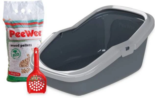 Makkelijk, veilig en duurzaam: het PeeWee-kattenbaksysteem is milieuvriendelijk en biedt u en uw kat het hoogste comfort. De slimme constructie met dubbele bodem bestaat uit twee bakken die boven elkaar worden neergezet. Door het rooster in de bovenste bak komt 90% van de urine in de onderste bak terecht. De rest wordt snel opgenomen door de natuurlijke houtkorrels en dat valt uit elkaar en wordt zaagsel. Dit valt tijdens het scharrelen door de gaten van de bovenste bak, terwijl de poten van uw kat droog en schoon blijven. Indien nodig kunt u de schep uit de set gebruiken om uitwerpselen uit de bovenste bak te verwijderen. Verder hoeft u, dankzij het uitgekiende systeem, alleen het vuile zaagsel in de onderste bak te verwijderen. De PeeWee houtkorrels zijn erg zuinig in verbruik, volledig biologisch afbreekbaar en hebben een hoog absorptievermogen. Ze neutraliseren ammoniakgeur en zorgen ervoor dat er geen onaangename geuren in huis ontstaan. Omdat de houtkorrels stofvrij zijn en extreem snel vloeistof opnemen, neemt uw kat geen vuil mee de woonkamer in. De perfecte oplossing voor mensen die op zoek zijn naar een milieuvriendelijke kattenbak, zonder af te zien van een comfortabele gebruik en maximaal welzijn voor uw huisdier. Deze PeeWee EcoMinor combi deal bestaat uit de volgende producten: PeeWee EcoMinor Kattenbak PeeWee schepje 3 kg houtkorrels Startpakket PeeWee EcoMinor in één oogopslag: Open kattenbak voor kattenrassen met een normaal postuur in een set met schepje milieuvriendelijke houtkorrels Slim ontwerp met dubbele bodem voldoet aan hoge normen van comfort duurzaamheid 2 bakken: bovenste bak met een zeef, de onderste bak vangt de urine en het zaagsel op Makkelijk gebruik:houtkorrels vallen uit elkaar na contact met urine en vallen door de zeef tijdens het scharrelen, zodat alleen de onderste bak geleegd hoeft te worden Droge en schone poten: zaagsel is stofvrij en kleeft niet aan poten en vacht na gebruik van het toilet Geurvrij: houtkorrels hebben een hoog absorptievermogen en neutraliseren onaangename geuren Afneembare naar binnen uitstekende beschermrand: beschermt tegen spatten, vergemakkelijkt het reinigen Zuinig in gebruik en milieuvriendelijk: 100% natuurlijk biologisch afbreekbaar houtafval, vrij van geurstoffen, bindmiddelen en andere chemicaliën, zuinig in het gebruik Kleur: zwart/antraciet of antraciet/grijs Materiaal: kunststof Afmetingen: Totaal: L 56 x B 39 x H 27,5 cm Instaphoogte voorkant: 11,5 cm (zonder rand ca. 10,5 cm) Instaphoogte achterkant:: 27,5 cm (zonder rand ca. 26 cm) Uitstekende beschermrand: ca. 3 cm.